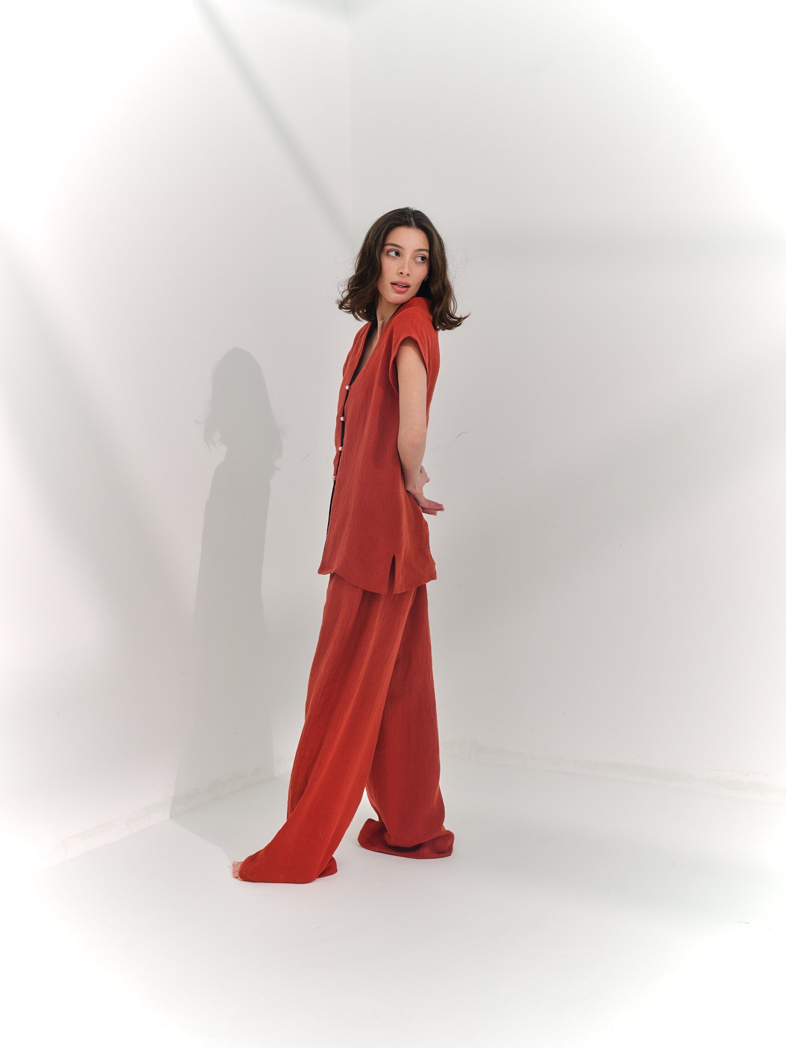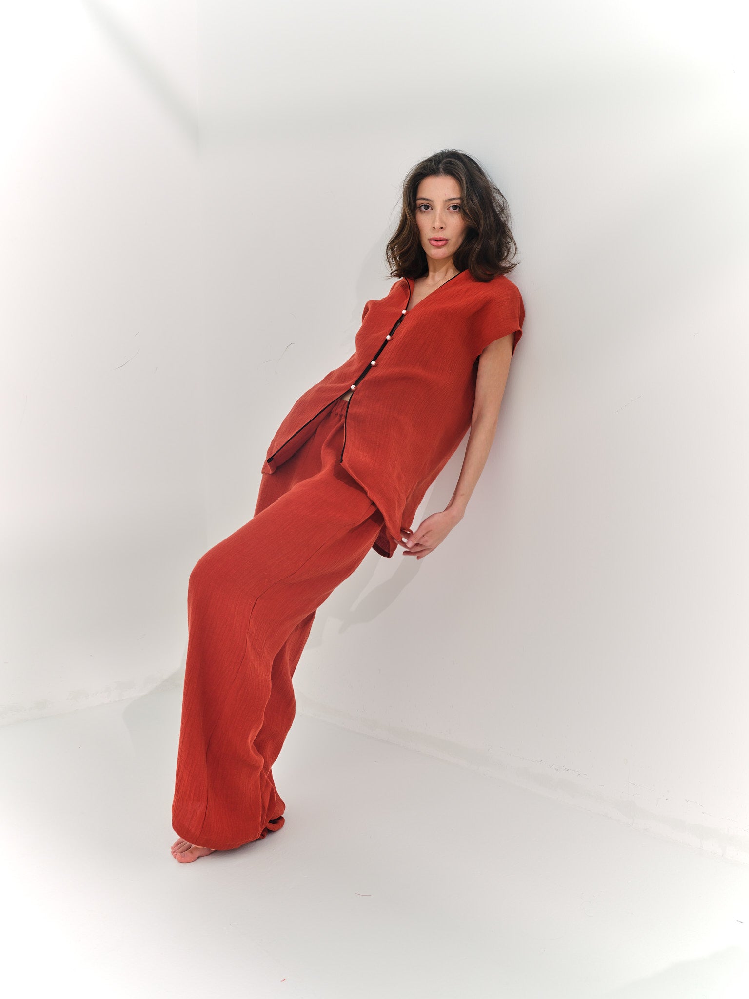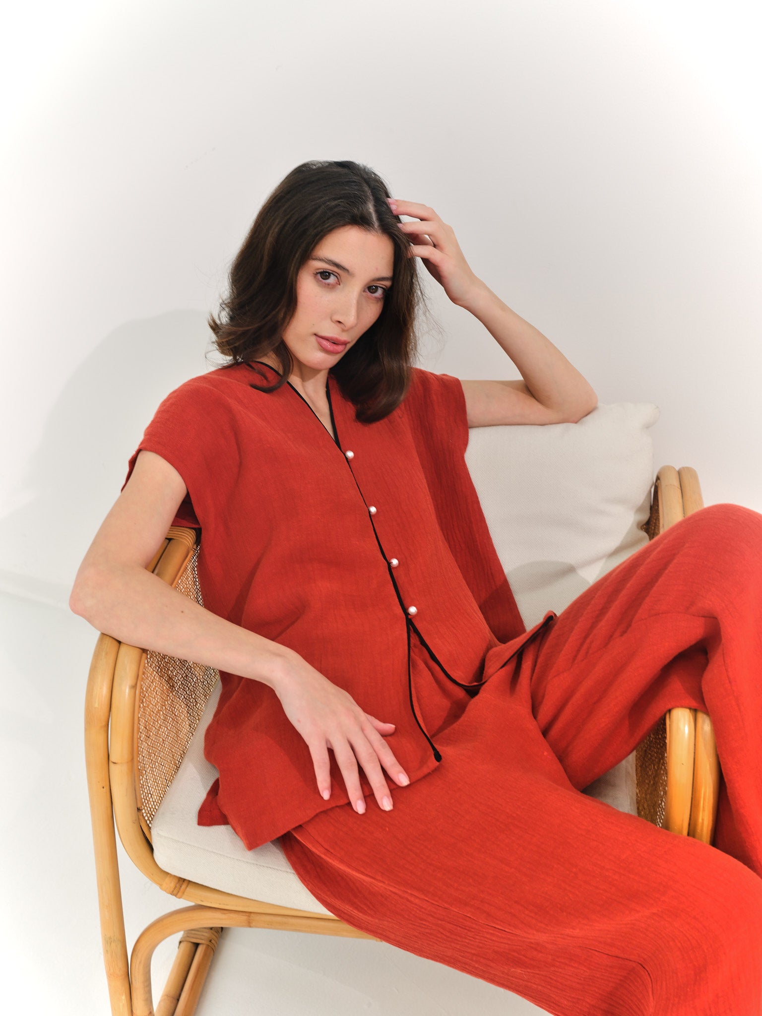Twin Set in CARROT, with hints of black inner detailing and pearl button down, this matching set is perfect for the summer if you want to add a pop of colour on an otherwise bright day! The trousers are relaxed fit with pockets and drawstring waist. The top is fluid fit with cap sleeves. Customization is available.