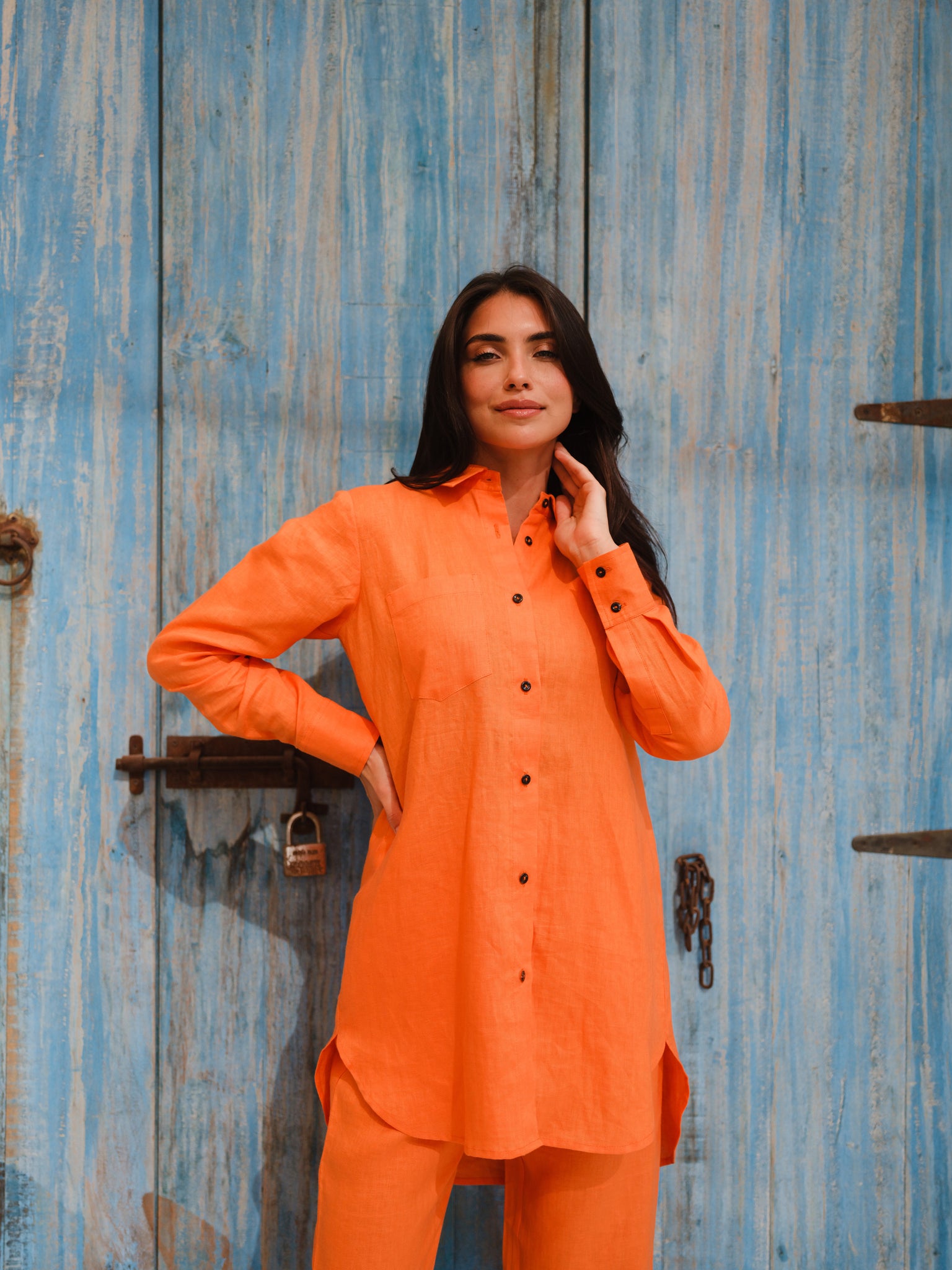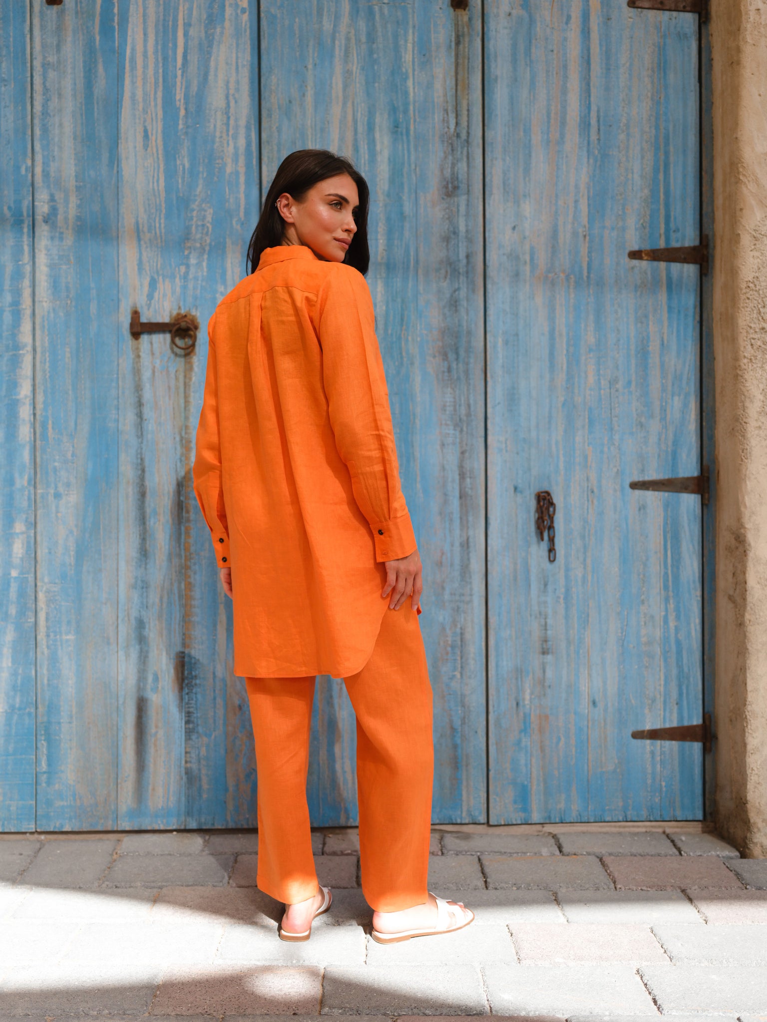 Available also in White, HESTIA is the ultimate summer outfit in pure linen and black detailing. The button-down shirt is oversized, longer in length from the back and cuff full sleeves. The trousers come with adjustable drawstring and pockets to give a more relaxed fit for the season.