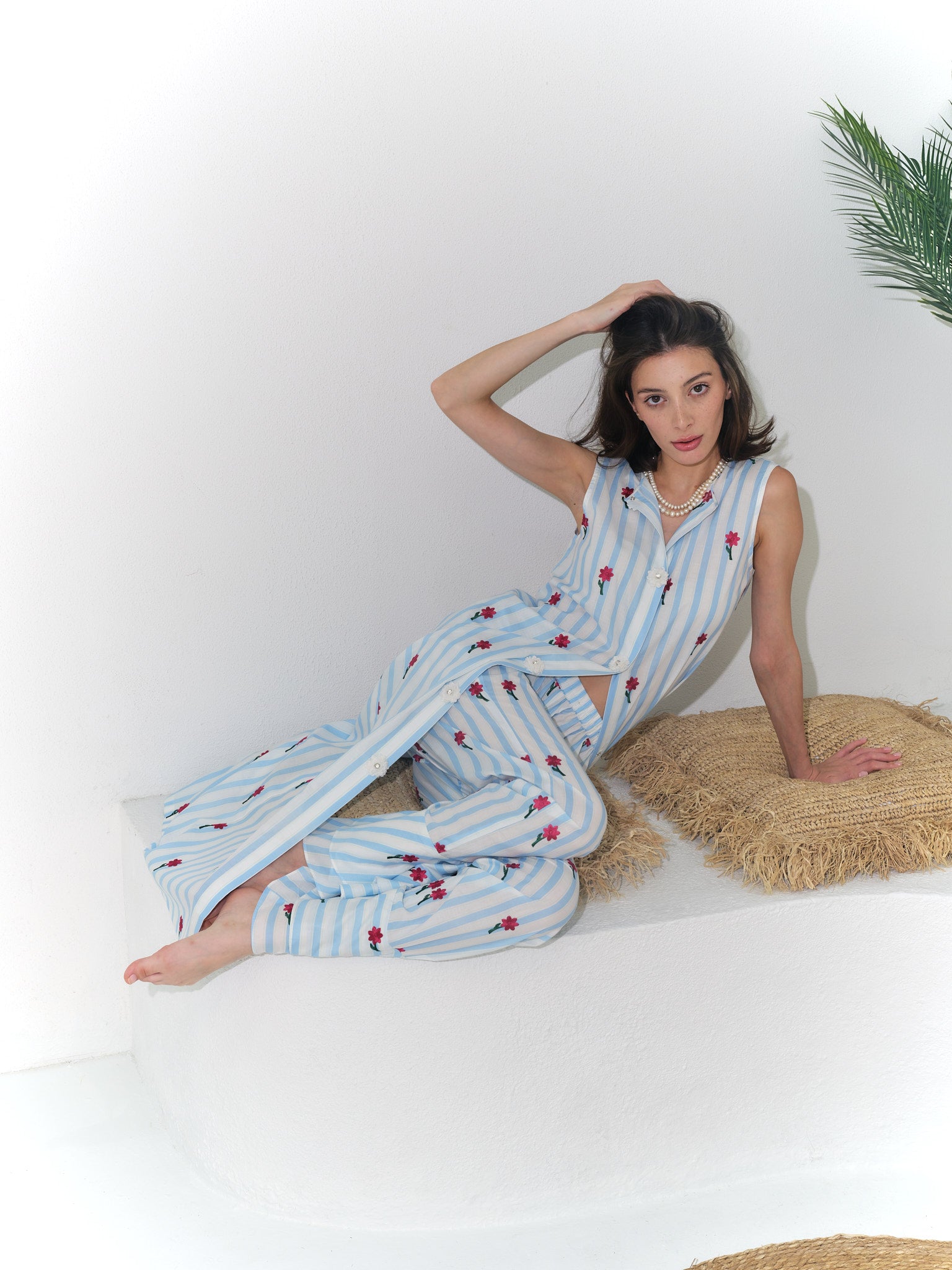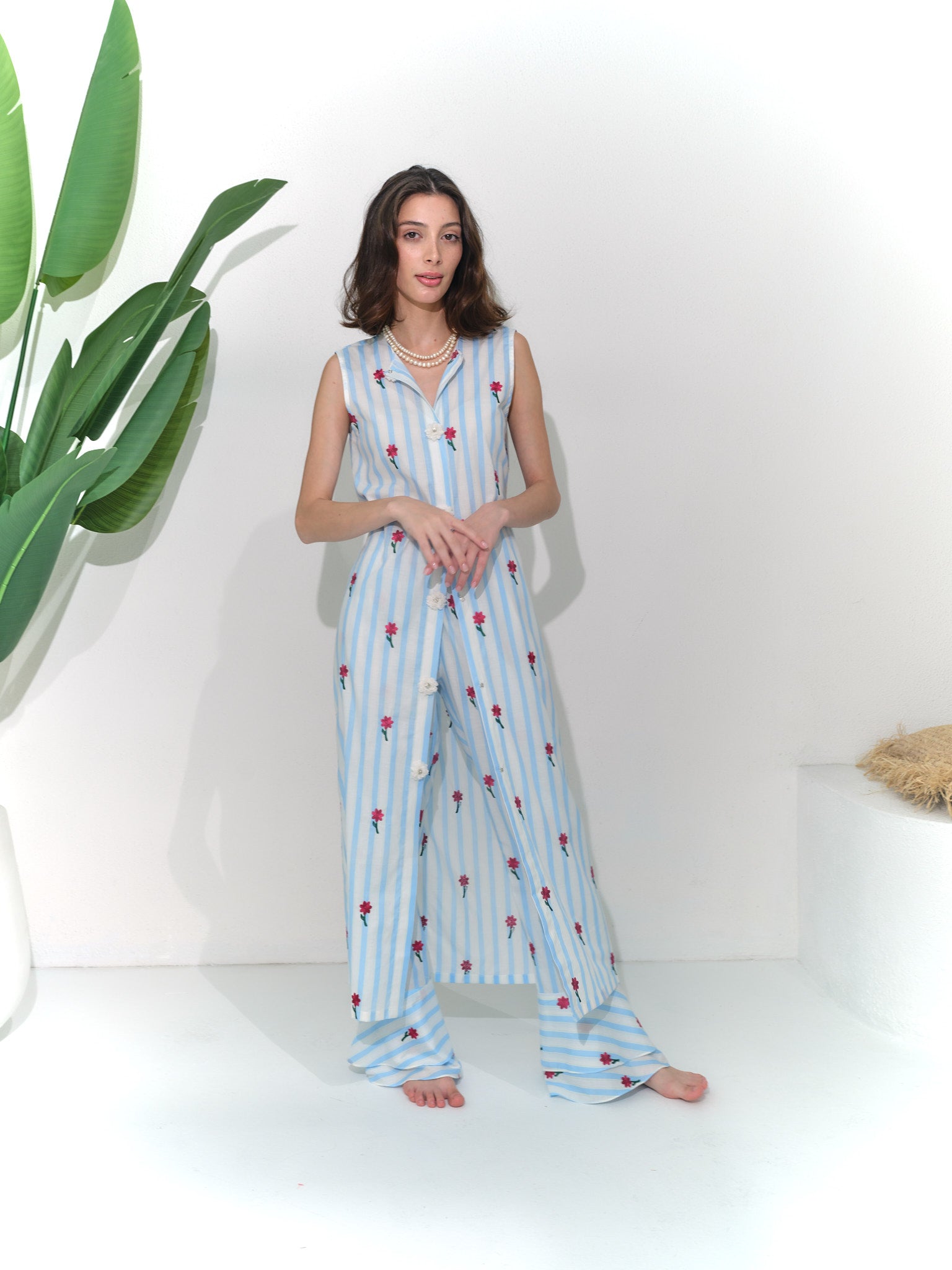 Made in cotton, the NAYA Set has little pink flower detailing and white flower buttons going all the way down for a personal preferred style. The trousers have ruffle detailing at the bottom, making it the perfect summer girl outfit.