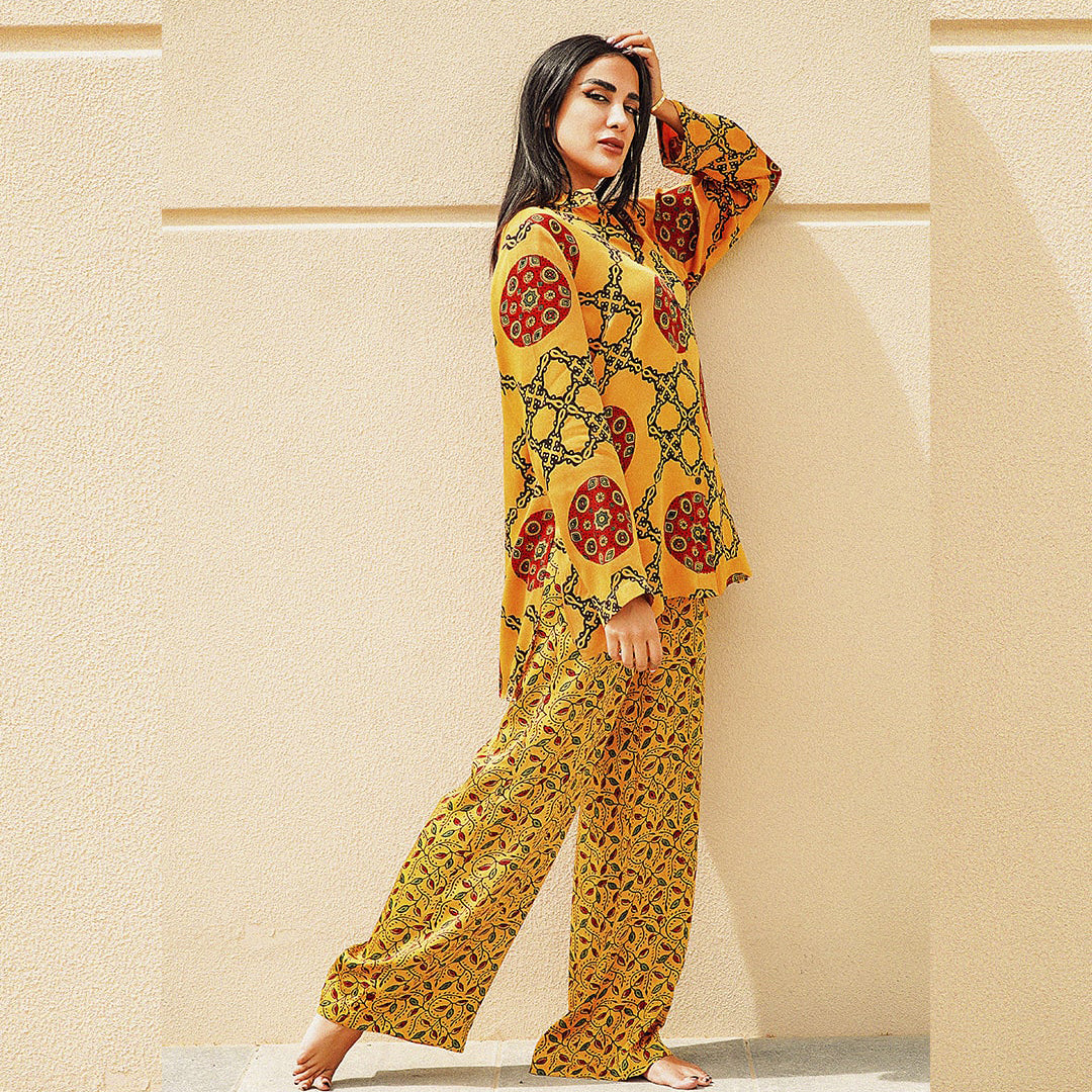 The Shirt is class button down with a longer back. The Pants have an elastic drawstring and are relaxed fit.
