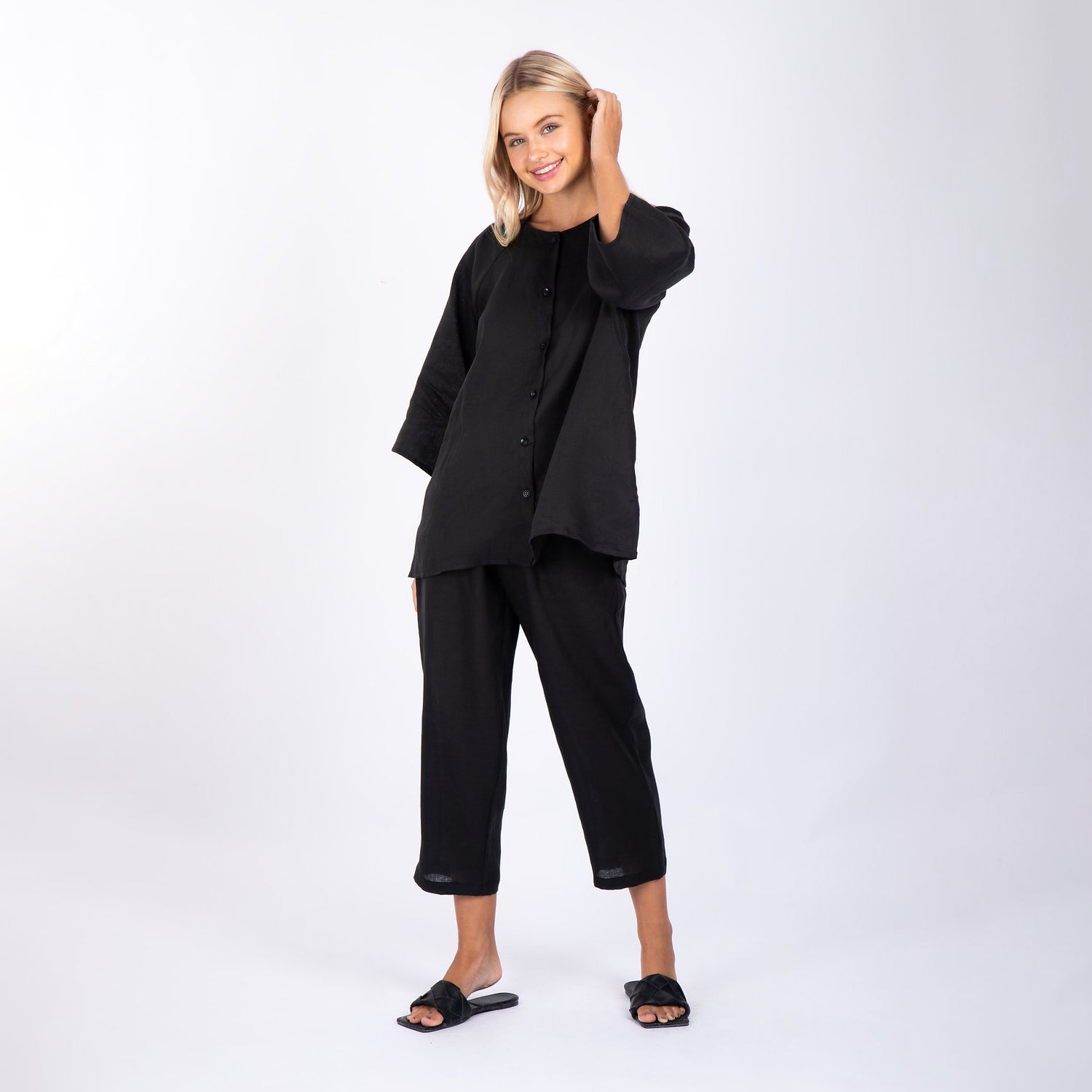 The "Laleh" Top and Pants come as a matching set. The Linen Button-Down Shirt is loose-fitted and can also be tied up or worn over a tank top! The Laleh Trousers have an adjustable drawstring and are a regular fit. This set also comes with an option to be worn with matching shorts.