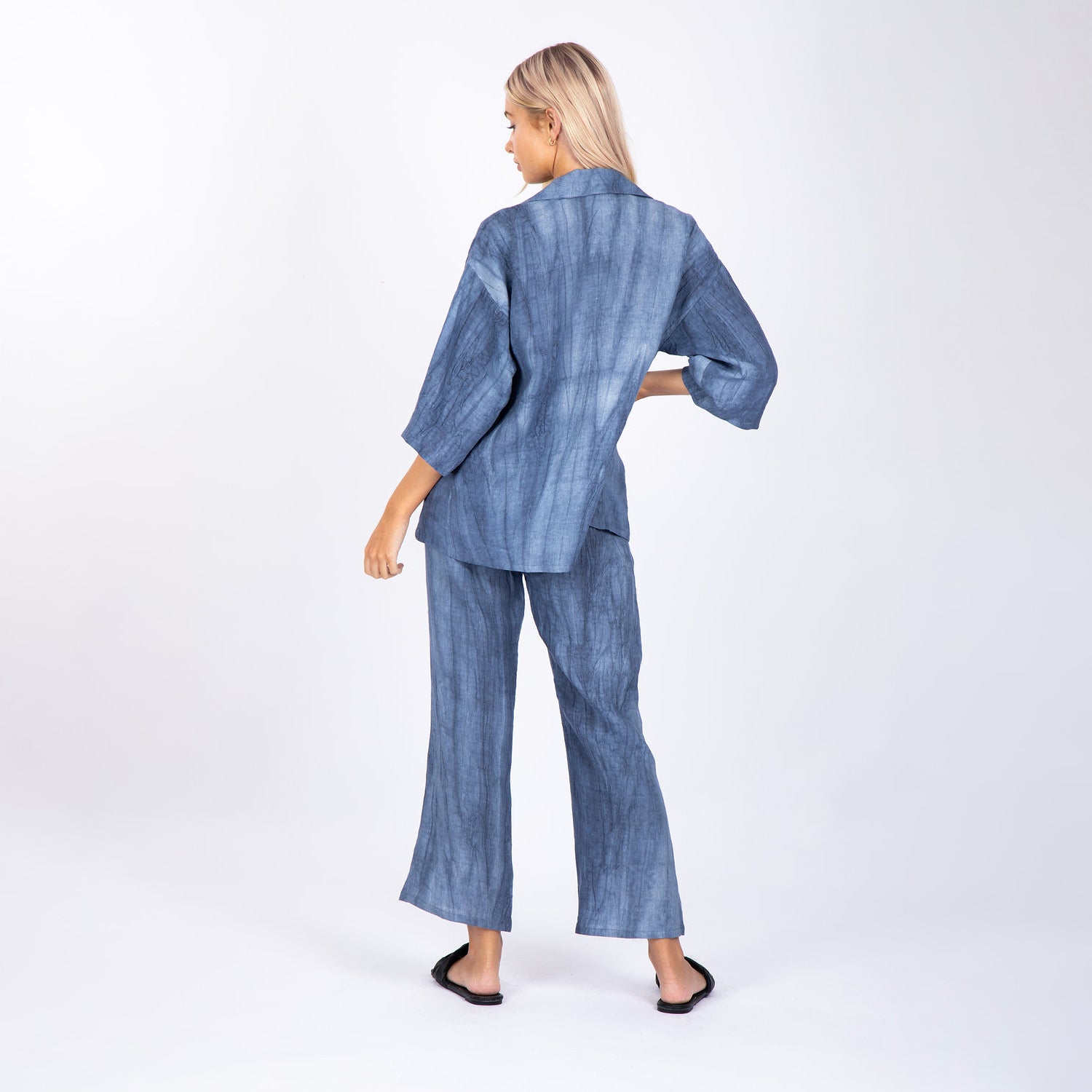 The elevated tuxedo set in blue tie-dye linen is tailored to perfection. Boxy and structured but fits seamlessly on all body types.